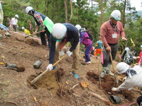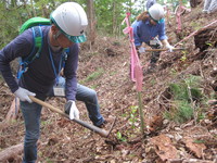 昼食後は、植樹場所に移動し、鍬を使って斜面に穴を掘り、しっかり育ってくれることを願いながら、モミジバフウの苗木を1本1本丁寧に植え付けました。