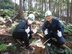 最初はノコギリの扱いにも苦労していましたが、高知東部森林組合の職員に助けられながら、自分たちで切った木がメキメキと音を立てて倒れる瞬間は、歓声と拍手が自然に沸き起こり、ハードな作業にも、達成感とともに皆さん清々しい表情で汗を流していました。