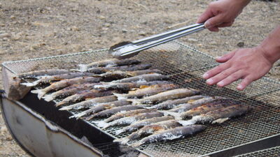 間伐作業で疲れ果てた後は、お弁当、鮎の塩焼き、いのしし汁など、ボリューム満点の昼食を楽しみました。