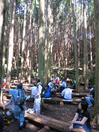 昨年に引き続き、三菱の創業者・岩崎彌太郎ゆかりの妙見山の協定林内で間伐材を使用したベンチに座り、自然を感じながら昼食を食べた後、スギ・ヒノキの間伐、雑木の除伐など体験しました。