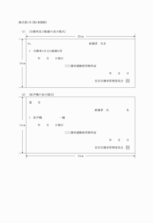 第1条 公職選挙法(昭和25年法律第100号。以下「法」という。)第141条第5項の規定による自動車、船舶又は拡声機の表示は、安芸市選挙管理委員会(以下「委員会」という。)が交付する様式第1号の表示板を用いてしなければならない。