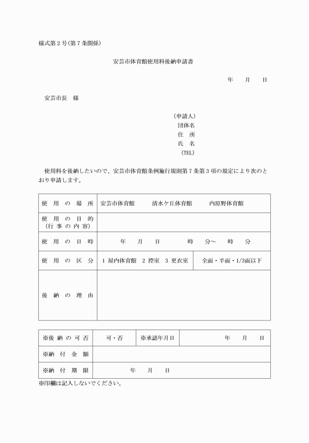 3 使用料を後納しようとする者は、安芸市体育館使用料後納申請書(様式第2号)を市長に提出しなければならない。