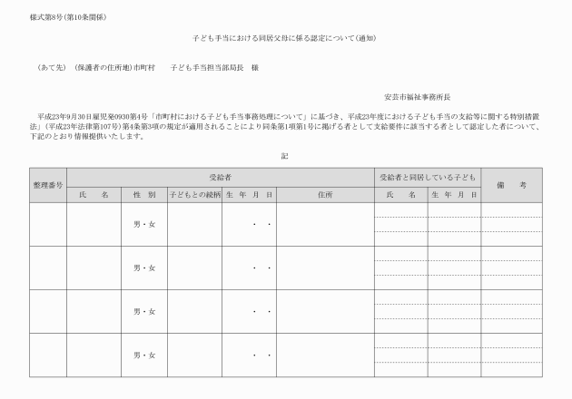 (5) 同居父母を認定した場合は、当該同居父母以外に子どもを監護し、かつ、生計を同じくする父又は母が住所を有する市町村(当該者が公務員である場合はその所属庁)に対して、同居父母を認定する旨を連絡するとともに、様式第8号により通知するものとする。(当該同居父母以外の者が同居父母と異なる市町村に住所を有する場合又は公務員として所属庁において受給している場合に限る。)