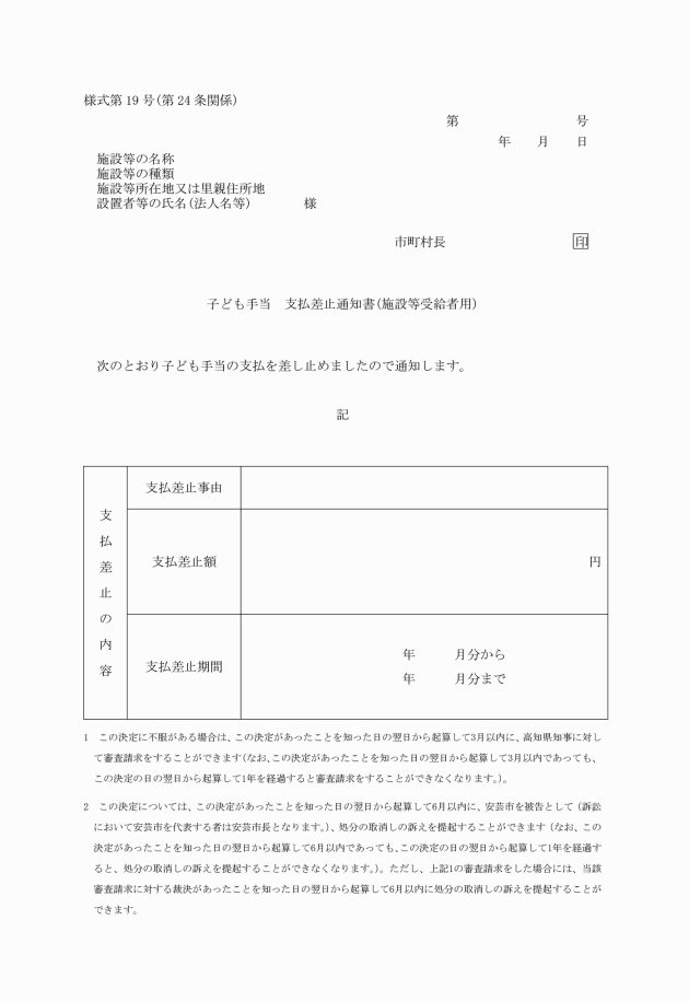 (1) 受給者台帳(施設等受給者用)の子どもの欄から改定の原因となる子どもを削除するとともに、改定後の支給額を記入するものとする。