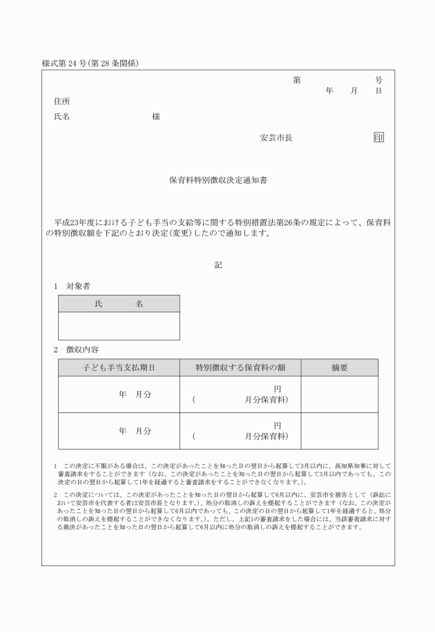 (1) 様式第24号の保育料特別徴収決定通知書(以下「特別徴収通知書」という。)を作成し、徴収対象者に予め送付するものとする。
