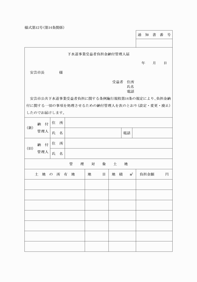第14条 受益者が市内に居住していないときで、市長が必要と認めたときは、受益者は、負担金の納付に関する一切の事項を処理させるため、市内に居住する者を納付管理人と定め、下水道事業受益者負担金納付管理人届(様式第12号)により市長に届け出なければならない。納付管理人を変更し、又は廃止した場合も同様とする。